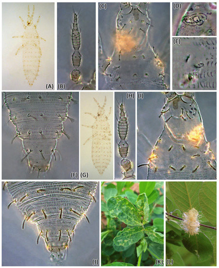 Enneothrips spp. larvae II and hosts. Enneothrips enigmaticus sp. n.: (A) Habitus; (B) Antenna; (C) Head and pronotum; (D) Mesothoracic spiracle; (E) Abdominal tergite II spiracle; (F) Abdominal tergites VI-X. Enneothrips flavens: (G) Habitus; (H) Antenna; (I) Head and thorax; (J) Abdominal tergites. (K) Damage of E. enigmaticus sp. n. on peanut leaflets; (L) Campomanesia guazumifolia, host of E. flavens.