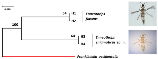 Bayesian tree of Enneothrips flavens and Enneothrips enigmaticus sp. n. haplotypes with posteriori probability values for each node/branch based on cytochrome c oxidase subunit I (COI) gene fragment sequences. The COI sequence of Frankliniella occidentalis (NCBI accession number: HQ930545) was used as the outgroup.