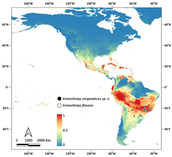 Enneothrips enigmaticus sp. n. and E. flavens are the only representatives of the genus occurring south of 20° S, and at present the only confirmed records are in South America, especially near the Tropic of Capricorn. Modelling, however, indicates that the species may find suitable conditions in other areas of the continent, especially in tropical countries (Figure 6).