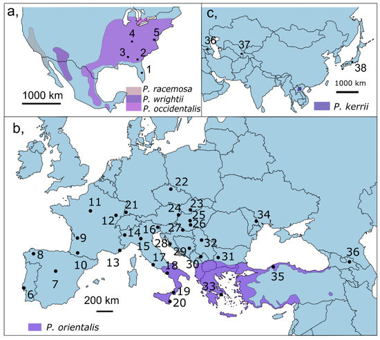 The sampling locations (1–38) of Corythucha cilata and the native range of Platanus spp. in (a) North America, (b) Europe, and (c) Asia. The native range of Platanus racemosa Nutt. ex Audubon, P. wrightii S. Wats., P. occidentalis, P. orientalis and P. kerrii Gagnep. are presented based on the map published by Feng et al. [82].