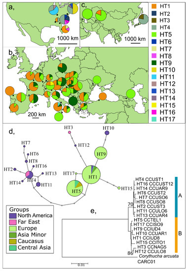 Distribution and phylogenetic relationship of Corythucha ciliata haplotypes on the long fragment of COI: (a) in North America, (b) in Europe, and (c) in Asia; (d) statistical parsimony networks for all haplotypes (empty circles indicate missing or theoretical haplotypes); and (e) ML consensus tree of all COI haplotypes. Bootstrap support values expressed in percentages are indicated near the nodes (>60%).