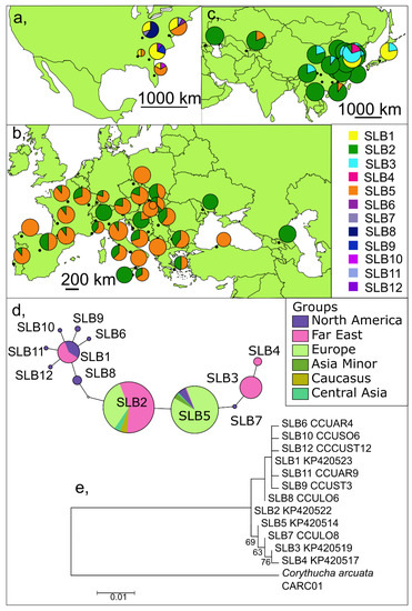 The haplotype SLB2 was detected in 43.52% of the individuals across the entire invaded area, but it could not be confirmed in the native area. The other common haplotype was SLB5 (37.33%), which was present across all continents. In our samples from Europe (SLB2; SLB5), Asia Minor (SLB5), Caucasus (SLB2), and Central Asia, (SLB2, SLB5) we detected only two haplotypes with various patterns. There were only two, albeit different, haplotypes from Japan (SLB1; SLB3). Yang et al. [74] detected five haplotypes from China (SLB1–5), where only SLB4 was unique. We revealed altogether eight haplotypes from North America (SLB1, SLB5, SLB6–12)—all of the later ones were unique. Neither the ML tree nor the haplotype network supports the existence of well-defined haplogroups on the barcode fragment of COI (Figure 3). We observed a moderate value of the haplotype diversity indices and a low value of the nucleotide diversity in the short fragment of COI (h = 0.66, π = 0.26%) (Table 3).
