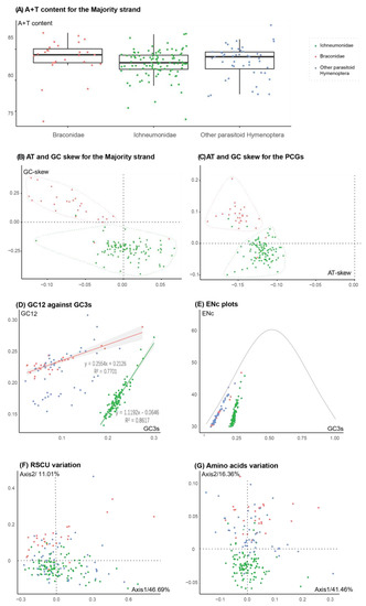 Base composition of the majority strand and the protein-coding genes (PCGs) of mitochondrial genomes (A–D) and the codon and amino acid usage bias in PCGs (E–G) for Ichneumonidae, Braconidae and other parasitoid Hymenoptera. (A) A + T content of the majority strand. (B) GC skew against AT skew of the majority strand. (C) GC skew against AT skew of PCGs. (D) GC12 against GC3s values of PCGs and the regression lines and equations with R values. (E) The ENc value against GC3s values and the standard curve representing the functional relation between ENc and GC3s under mutation pressure without selection. (C) The RUSC variation on the two principal correspondence analysis axes. The total inertia is 0.073018. The explanation of the variation of Axis1 is 46.69% and Axis2 is 11.01%, and others are lower than 5%. The abnormal species are demonstrated by their position on Axis1. (D) The amino acid usage variation on the two principal correspondence analysis axes. The total inertia is 0.008047. The explanation of the variation of Axis1 is 41.46% and Axis2 is 16.36%, and others are lower than 13%.