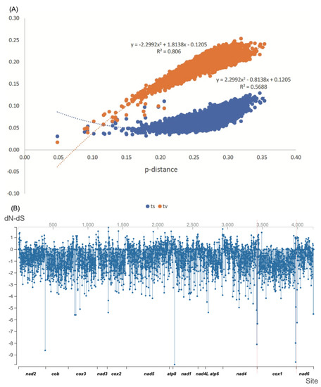 For testing the substitutional saturation of Ichneumonidae mitochondrial protein-coding genes, the pairwise distance (transitions, ts; transversions, tv; ts and tv) was computed with a p-distance model in MEGAX [41]. The results were plotted as ts and tv for each pair of taxa against the total p-distance (ts and tv) and fitted with a 2nd order polynomial regression line. The non-synonymous substitution rate (dN) and the synonymous substitution rate (dS) for 4225 codons from all PCGs were calculated on the website Datamonkey (http://www.datamonkey.org/, Access date: 14 February 2020) based on the Single-Likelihood Ancestor Counting (SLAC) model with a p-value threshold of 0.1 [44].