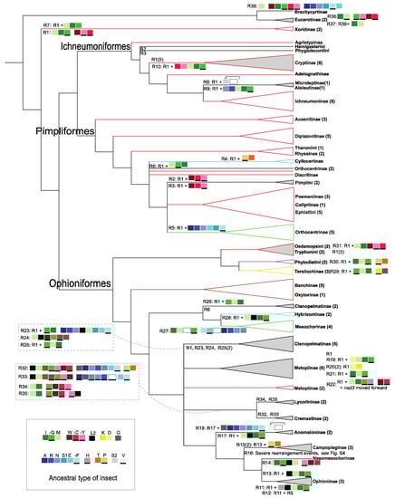All types of gene rearrangement in the Ichneumonidae mapping of the consensus tree mainly based on AA matrices. The tRNA genes were colored out and the lines in the bottom of gene blocks indicate the gene coding on the minority strand. The ancestral type of tRNA gene clusters for insect is in the box at the lower right corner. The triangles represent the stable monophyletic groups, of which the triangles filled in gray indicate that the group has more than one type of gene rearrangement. The numbers of species are in the brackets. The genes rearrangement types are near to the corresponding branch, and the branches with R1 (rearrangement type 1) are colored in red. The complete gene orders for each species are in Figure S5 (types: R1–R38).