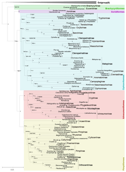 - Bennett, A.M.R.; Cardinal, S.; Gauld, I.D.; Wahl, D.B. Phylogeny of the subfamilies of Ichneumonidae (Hymenoptera). J. Hymenopt. Res. 2019, 156, 1–156. [Google Scholar] [CrossRef]
