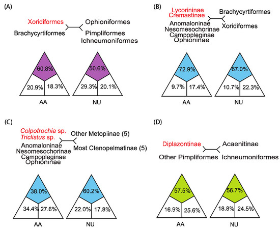 Results from likelihood mapping based on both AA and NU matrices. For analysis of conflict nodes, the conflict nodes in tests are at the top corners of rectangles. The relationship on the top of each triangle is supported by the colored area. (A) Test for the placement of Xoridi-formes, which indicates that Xoridiformes is close to Brachycytiformes by both AA and NU ma-trices. (B) Test for the placement of group (Lycorininae + Cremastinae), which indicates that group (Lycorininae + Cremastinae) is close to group (Anomaloninae + Nesomesochorinae + Campopleginae + Ophioninae) by both AA and NU matrices. (C) Test for the placement of group (Colpotrochia sp. + Triclistus sp.), which indicates that group (Colpotrochia sp. + Triclistus sp.) is close to group (Anomaloninae + Nesomesochorinae + Campopleginae + Ophioninae) by both AA and NU matrices. (D) Test for the placement of Diplazontinae, which indicates that Diplazonti-nae is close to the Pimpliformes excepting for Acaenitinae by both AA and NU matrices.