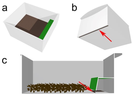 Based on the results of the previous experiments, we attempted to build an apparatus capable of inducing prepupae to separate from younger instars (self-harvesting). This consisted in a plastic box (29 × 35 × 17 cm) in which a covered area was added. The covered area was placed near one of the short sides of the box, characterized by the presence of a plastic barrier obscuring light. The barrier consisted in a roof (6 cm tall) and a lateral semi-wall allowing the larvae to enter through a narrow passage at its base (1 cm wide) which was left opened towards the non-covered side of the box (Figure 2). Larvae entering the covered area would then find a transversal slit on the floor adjacent to the side of the box (1 × 29 cm), through which they could fall into a collecting arena placed below. In each experiment, we introduced into the open area 300 g of substratum (residual waste produced by the larvae feeding activity, maintained at 24 °C for 48 h), as well as 50 prepupae, 50 larvae of the 6th instar and 50 larvae of younger instars. Experiments lasted 45 min after the insertion of the larvae and prepupae into the boxes; at the end, we counted the larvae and prepupae found in the collecting area. The experiments were carried on exposing the larvae and prepupae to three different conditions of moisture of substratum composed by residual waste: low moisture (no water added to the substratum, RH: 10–11%), medium moisture (6 mL of water per 40 cm2 of substratum, RH: 22–23%) and high moisture (13 mL of water per 40 cm2 of substratum, RH: 33–34%). Moreover, five light conditions were obtained through the use of commercially available lamps or ambient light as in the previous experiment (lux measurement with a Delta Ohm Hd 8366 luxometer). Here we only focused on ambient light, as the simplest solution achievable, and infrared light as the better-performing based on the locomotory speed experiment, and therefore we utilized the following treatments: 6 lux, 12 lux, or 60 lux (ambient light reduced by a filter), 210 lux (ambient light), >7000 lux (infrared light obtained with a lamp). A total of 10 replicas was conducted for each of the possible combinations of moisture and light conditions (n = 3 × 5 × 10 = 150).