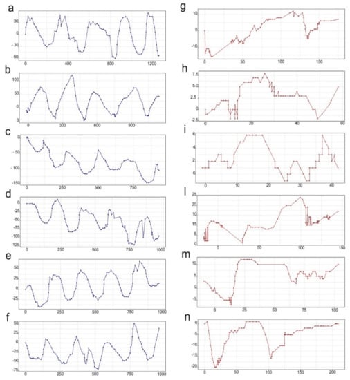 Locomotory patterns of 6th instar larvae (a–f) and prepupae (g–n) as described by the trajectory-tracking function of the software Kinovea. The X-axis and Y-axis indicate the horizontal and vertical components of the registered respectively movements.