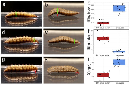 Movements in the locomotory pattern of 6th instar larvae (a,d,g; n = 10) and prepupae (b,e,h; n = 10) and analysis of their differences through measurements (c,f,i). Each row corresponds to one of the three movements: i = when the larva stretched its head forward (a,b), ii = when the head then touched the surface before being used as a pin to crawl forward (d,e); iii = when the head is used as a pin to crawl forward (g,h). In pictures (a–e) the red line and green lines indicate the measured characters (the length of the red line is divided for the length of the green one to compute the lifting index), in pictures (g,h) the measured angle is indicated in red.
