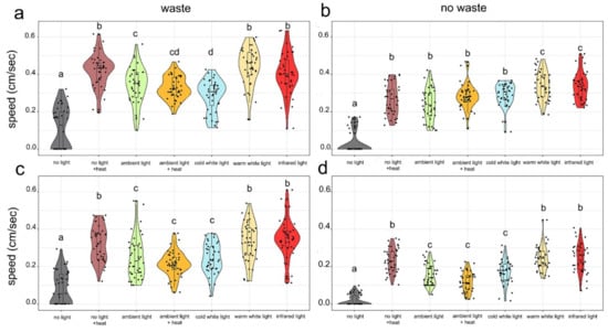 We detected significant differences in the speed of larval locomotion depending to the different light and heat conditions that were tested, for: 6th instar larvae with waste as a substratum (H(6) = 130.69, p < 0.001), 6th instar larvae without waste as a substratum (H(6) = 141.68, p < 0.001), prepupae with waste as a substratum (H(6) = 168.19, p < 0.001) and prepupae without waste as a substratum (H(6) = 123.71, p < 0.001). The waste substratum resulted in an averagely slower movement locomotory speed (Figure 5). Pairwise comparisons revealed that a quicker locomotion was always performed under warm white light and infrared light treatments. In addition, the No light + heat treatment was not significantly different from the aforementioned two in all cases except for that of 6th instar larvae with waste substratum. Conversely, larval locomotion was very slow in the absence of both light and heat (no light treatment).