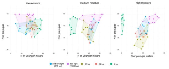 Scatter plots describing the number of prepupae (y axis) and younger larvae (x axis) found in in the collecting arena following separation experiments conducted at different moisture conditions and under different light treatments. A higher efficiency is reached near the upper-left corner of the graph, indicating a high number of prepupae but also a low number of younger instars at the same time.