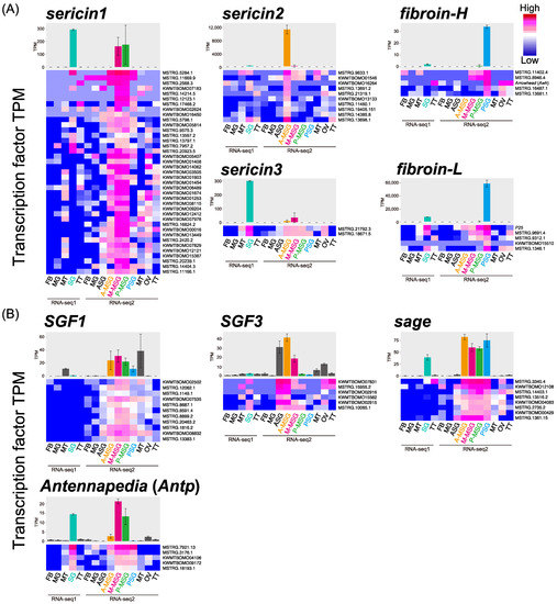 TPM (mean ± SE, biological triplicates) of silk protein genes (A) and TFs (B) from RNA-seq analysis and heatmap that was based on TPM of each module gene. The sericin1 and sericin2 graphs were drawn based on TPM values of main transcripts (sericin1: KWMTBOMO06216, sericin2: KWMTBOMO06334). Transcript ID is indicated on the right. Tissues that were used for RNA-seq are indicated under the heatmap.
