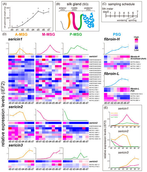 Wet weight transition of the whole SG during last instar larva (A). Different letters indicate significant differences in each gene (Tukey–Kramer test, p < 0.05). Schematic of the whole SG (B). Sampling schedule for qRT-PCR during last instar larva (C). The relative expression levels (mean ± SE, biological triplicates) of silk protein genes at each SG region during the last instar period, and a heatmap that was based on the expression of silk protein genes and their module TFs (D). Integrated graphs (mean ± SE, biological triplicates) showing sericin expression at each MSG region (E). Transcript ID is indicated on the right.