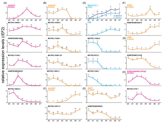 Relative expression levels (mean ± SE, biological triplicates) of each target gene and TFs at each SG region during last instar period [sericin1 (A), sericin2 (B), sericin3 (C), fibroins (D), SGF1 (E), SGF3 (F), sage (G), and Antp (H)]. Different letters indicate significant differences in each gene (Tukey–Kramer test, p < 0.05).
