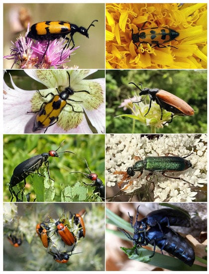 - Bologna, M.A.; Turco, F.; Pinto, J.D. 11.19. Meloidae Gyllenhal, 1810. In Volume 2 Morphology and Systematics (Elateroidea, Bostrichiformia, Cucujiformia Partim); Leschen, R.A.B., Beutel, R.G., Lawrence, J.F., Eds.; De Gruyter: Berlin, NY, USA, 2011; pp. 681–693. ISBN 3-11-091121-3. [Google Scholar]