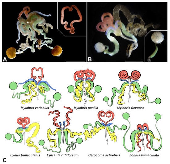 - Gerber, G.H.; Church, N.S.; Rempel, J.G. The Anatomy, Histology, and Physiology of the Reproductive Systems of Lytta nuttalli Say (Coleoptera: Meloidae). I. The Internal Genitalia. Can. J. Zool. 1971, 49, 523–533. [Google Scholar] [CrossRef]