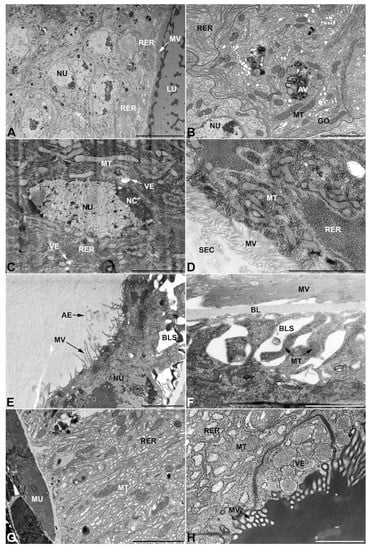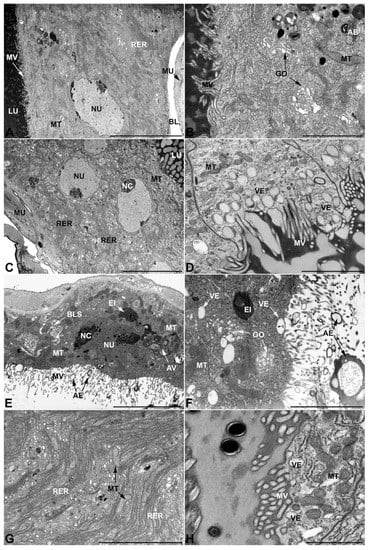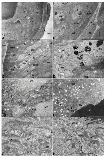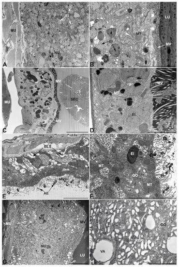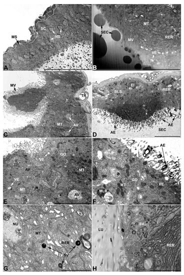 - First pair of male accessory glands in M. variabilis. The first pair of male accessory has an outer muscular layer composed of an inner circular and outer longitudinal fibers enclosing a monolayered epithelium (Figure 3A–C). This latter circumscribes a large lumen filled with a homogeneous electrondense matrix in which irregularly shaped structures of higher electron density are immersed (Figure 3A). The mononucleated epithelial cells are about 35 μm high and lie on a basal lamina 0.4–0.6 μm thick (Figure 3B,C); they are tightly appressed to each other with a straight course along their medial regions (Figure 3C) and more sinuous contours towards the apex and base (Figure 3B–D). The apical plasma membrane is always characterized by the presence of many partially overlapping and crowded microvilli that face the glandular lumen (Figure 3E,F). The ovoid nucleus, approximately 7–10 μm in size, frequently shows indentations and one or two prominent nucleoli (Figure 3B–D). It is usually located in the basal region of the cell (Figure 3A,B), however, due to the pseudostratified organization of this epithelium, it may occupy medial or more apical positions, pushing towards the glandular lumen (Figure 3A,D). The rough endoplasmic reticulum is widely disseminated throughout the cytoplasm in the form of densely packed, parallel-arranged cisternae, and is most commonly found at the base of the cell and in the perinuclear region (Figure 3B–E). Golgi systems are relatively small and uncommon while many thin and slender mitochondria are evenly distributed throughout the cytoplasm (Figure 3B–H) that is also characterized by the presence of several vesicles. Larger ones, containing irregular and electrondense material, are located medially in the cells (Figure 3D); in contrast, the smaller and more common electronlucid vesicles are mostly located in the apical region (Figure 3E,F,H), near the dense array of packed microvilli. Rare electrondense granules appear nearby and scattered between some of the microvilli (Figure 3F).