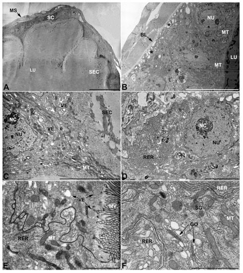 Figure 4. Ultrastructure of the second pair of male accessory glands in M. variabilis. (A) Cross section of the gland showing tissue pleats towards the lumen. (B) Micrograph showing the basal region of the cells with moderate folds of the basal membrane (indicated by the asterisks) and muscle fibers surrounding the secretory cells. (C) Close up at the level of the involution, displaying abundance of mitochondria and vesicles near the microvillated apical membrane. Some electrondense granules can also be observed in the cytoplasm. (D) Nucleus with obvious nucleolus surrounded by abundant flattened stacks of rough endoplasmic reticulum. (E) Apical region of the cell bearing microvilli. Note the sinuous contours of the lateral membranes of two neighboring cells, slender mitochondria and vesicles. (F) Close up showing flattened Golgi complex, thin mitochondria, dark granules and rough endoplasmic reticulum with both flattened and expanded cisterns. BL, basal lamina; GO, Golgi complex; LU, lumen; MS, muscular sheath; MT, mitochondria; MV, microvilli; NC, nucleolus; NU, nucleus; RER, rough endoplasmic reticulum; SC, secretory cells; SEC, secretions; VE, vesicles. Scale bars: (A) = 50 μm; (B) = 20 μm; (C) = 10 μm; (D) = 5 μm; (E,F) = 2 μm.