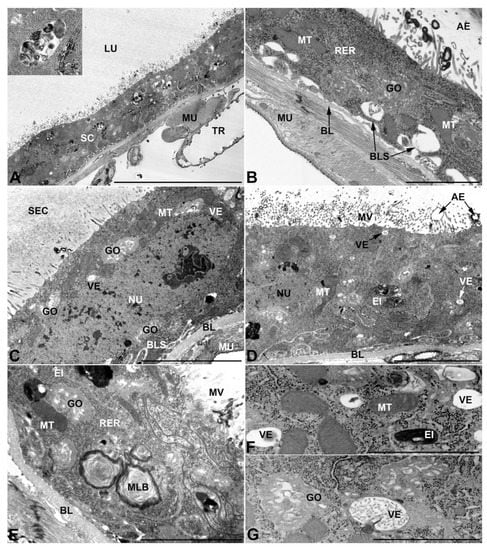 - Third pair of male accessory glands in M. variabilis. The third pair of male accessory glands is composed of a comparatively thin layer of circularly and transversely oriented muscles, gently surrounding a monolayer epithelium that delimits a large lumen filled with a homogeneous secretion that appears as slightly electrondense fibrillar structures immersed in an almost lucid matrix (Figure 5A). The glandular cells, 5–8 μm high, are flattened, squamous or barely cuboidal and lay on a basal lamina 0.4–0.6 μm thick (Figure 5A–E). Their basal membrane is usually highly folded and only partially attached to the basal lamina, creating a developed labyrinthine network of intercellular spaces (Figure 5B,C). A basal and oval nucleus, 10–12 μm long, contains a large nucleolus and heterochromatin aggregates, and is surrounded by flattened stacks of rough endoplasmic reticulum and abundant Golgi complexes featuring small cisternae that are widespread in both the basal and apical regions of the cells (Figure 5C–E). The cytoplasm abounds in mitochondria and contains several small electronlucid vesicles, some of which contain a fine flocculent particulate (Figure 5B–F). A few electrondense secretory granules and rare multilamellar bodies are found basally in the cell (Figure 5D,E). Autophagic vacuoles containing irregular electrondense inclusions are also frequently present in the cytoplasm (Figure 5A, inset). Apically, the plasma membrane develops into widely spaced, long microvilli, some of which show a characteristic irregular, ampullaceous expansion with marked dark edges (Figure 5B,D).