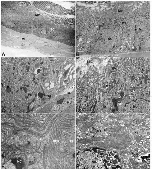 Epithelial cells, 13–18 μm high, are cuboidal or slightly columnar and have a single oval nucleus 10 μm long with peripheral clumps of heterochromatin (Figure 6A,B). Nuclei are basally located in the cell, more or less along a single line within the epithelium (Figure 6A). Adjacent cells are usually tightly adherent to each other and firmly attached to a 0.3–0.45 μm thick basal lamina that interposes itself between the cells and the muscles (Figure 6B,C). Nevertheless, in some of its sections the epithelium develops fairly basolateral intercellular spaces (Figure 6C); in both cases, the plasma membranes exhibit a moderately sinuous course. Abundant mitochondria are mainly distributed apically and present themselves in quite different forms, most are moderate in size, thin and elongated, while a smaller number appear as more condensed, larger and with expanded or angular forms (Figure 6B–D). Rough endoplasmic reticulum membranes are present both as flattened, parallel-arranged cisternae and as expanded and swollen cisternae (Figure 6E). Many small electronlucent vesicles, some electrondense inclusions and rare secretory granules are dispersed in the cytoplasm (Figure 6C,F) while long overlapping microvilli can be observed on the apical surface of the cell facing the lumen (Figure 6B,D).
