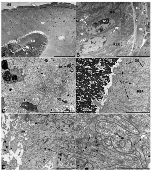 - Second pair of male accessory glands in M. variabilis. The second pair of male accessory glands has an outer muscular layer, made up of circular muscles on the inside and longitudinal outside, which encloses a glandular epithelium (Figure 4A,B). The columnar epithelial cells, roughly 25–30 μm high, are organized as a monolayer that exhibits pleats and ensuing involutions towards a large lumen (Figure 4A,C) that receives the secretory products appearing as dark amorphous bodies immersed in a lighter homogeneous matrix (Figure 4A–C). Contiguous cells are usually tightly adherent to each other and appressed to the basal lamina, however, in some regions of the epithelium they are partially detached from a 0.6–0.8 μm thick basal lamina, showing moderate folds and intercellular spaces in the baso-lateral plasma membrane (Figure 4B). A single ovoid nucleus of about 10 μm, with no indentations or lobes, is placed towards the center of the cell and is characterized by the presence of an evident central or eccentric nucleolus and sparse heterochromatin (Figure 4B–D). The rough endoplasmic reticulum is well-developed (Figure 4D–E) and located mostly near the nucleus, primarily in the form of parallel and flattened cisternae and, to a lesser extent, also in a vesiculate form with expanded cisternae (Figure 4F). Thin mitochondria (Figure 4C,E,F) are abundantly distributed throughout the cell, although they are more prevalent towards the apical region where stacks of long microvilli arise from the apical plasma membrane (Figure 4B,C,E). Several small vesicles with electronlucent contents and a few slightly electrondense secretory granules are disseminated throughout the cytoplasm (Figure 4C,E,F), while small and flattened Golgi complexes are rarely observed in these cells (Figure 4F).