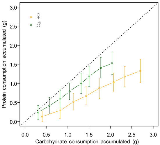 Mean consumption of protein and carbohydrate accumulated (g) during the 8 weeks when individuals had access to the choice diet. The error bars represent the standard deviations. The dotted black line represents the expected intake trajectory if feeding had occurred randomly between the two diets.