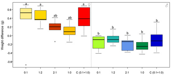 Body mass gain (body mass difference between the end and the beginning of the experiment) per diet (fixed diets: 0:1, 1:2, 2:1, and 1:0 P:C; and choice diet: C (0:1 + 1:0)) for female (♀) and male (♂) individuals. The boxes represent the first and third quartiles and the median. The whiskers represent the maximum and minimum values. The circles represent the outliers. Different letters indicate a pairwise comparison with p ≤ 0.05.