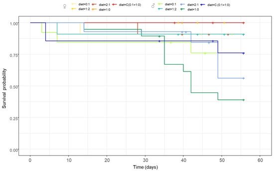 The dietary P:C ratio did not affect survival, and females exhibited higher survival, regardless of the diet consumed (Figure 4, diet × sex: z = −0.99, p = 0.321; diet: z = 0.51, p = 0.604; sex: z = 1.95, p = 0.050).
