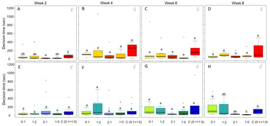 Decision time to leave the shelter per week for females (week 2 (A), week 4 (B), week 6 (C), and week 8 (D)) and males (week 2 (E), week 4 (F), week 6 (G), and week 8 (H)). Individuals fed on the four different fixed diets (0:1, 1:2, 2:1, and 1:0 P:C) and on the choice diet (C(0:1 + 1:0)). The boxes represent the first and third quartiles and the median. The whiskers represent the maximum and minimum values. The circles represent the outliers. Different letters indicate a pairwise comparison with p ≤ 0.05.