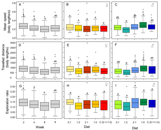 Mobility and exploration. Time affects the speed (A), distance traveled (D), and exploration ratio (G) of individuals. Diet, fixed diet (0:1, 1:2, 2:1, or 1:0 P:C) or choice diet C(0:1 + 1:0)), does not have an effect on these metrics in females (B,E,H), but it does in males (C,F,I). The boxes represent the first and third quartiles and the median. The whiskers represent the maximum and minimum values. The circles represent outliers. Different letters indicate a pairwise comparison with p ≤ 0.05.