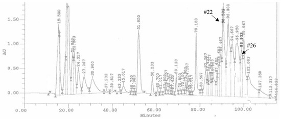 Chromatogram of HPLC analysis of OPs deriving from two equivalent females. Arrows show the retention times related to the biologically active fractions: fractions #22 and #26, respectively.