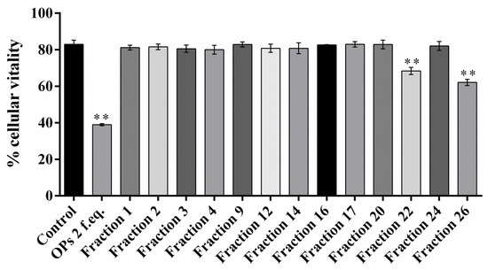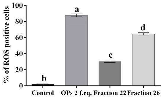 Hemocytes were stained with 2,7 dichlorodihydrofluorescein acetate (H2DCFDA) after the treatment with OPs, and both fractions showed fluorescent signals indicative of oxidative stress (Figure 7c,d), while no signal was detected in control cells (Figure 7a). The percentage of hemocytes showing oxidative stress after incubation with OPs in toto was 87.65 ± 3.17%, 30.69 ± 2.53% after fraction #22 treatment, and 64.58 ± 2.48% after fraction #26 treatment (Figure 8).