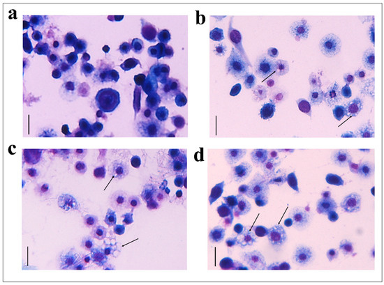 May–Grunwald–Giemsa staining of hemocytes treated with 1 X PBS (control) (a), with OPs deriving from two equivalent females, (b) fraction #22 (c) and fraction #26 (d) for 2 h stained with May–Grunwald–Giemsa dye. Scale bar 10 µm. The process of vacuolization is indicated by arrows.