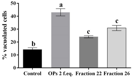 The hemocytes were incubated for 2 h with each fraction and stained with the May–Grunwald–Giemsa dye staining that allows to detect changes of intracellular pH, often correlated with cytoplasmic vacuolization occurring after exposure to bacterial and viral pathogens or to various natural and artificial compounds [42]. Cells treated with fractions #22 and #26 showed pinkish-red acidophilic cytoplasm (Figure 3c,d) with a percentage of vacuolization major (Figure 4) to the control in which most of the cells show a not-vacuolized basophil dark blue cytoplasm (Figure 3a) (control = 14.22 ± 2.40%, OPs = 43.07 ± 4.84%, fraction #22 = 24.09 ± 1.43%, fraction #26 = 30.88 ± 3.48%).