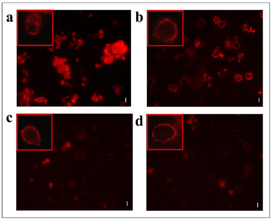 TRITC-conjugated phalloidin staining of hemocytes treated with 1 X PBS (control) (a) or treated with OPs deriving from two equivalent females, (b) fraction #22 (c) and fraction #26 (d). Scale bar 10 µm. In red boxes, enlarged cells are reported.