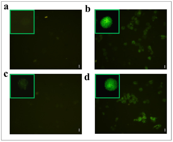 H2DCFDA staining of hemocytes treated with 1 X PBS (control) (a) or treated with OPs deriving from two equivalent females, (b) fraction #22 (c) and fraction #26 (d). Scale bar 10 µm. In green boxes, enlarged cells are reported.