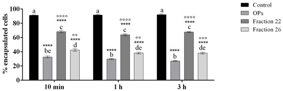 Encapsulation of chromatographic spheres extracted after 6 h from larvae treated with 1X PBS (control), OPs deriving from two equivalent females (2 f. eq.), #22 and #26 fraction at 10 min, 1 h, or 3 h before injection of spheres. Data are reported as mean ± SEM of n = 3 independent experiments. Statistical analysis was performed with one-way ANOVA and Bonferroni post hoc test. Different letters indicate significant differences among all treatments (p value < 0.0001), asterisks indicate significant differences between control and treated samples at the same experimental time (p value < 0.0001), and dots indicate significant differences between OP treatment,#22 and #26 fraction treatment at the same experimental time (°°°° p value < 0.0001, °°° p value < 0.001, °° p value < 0.01).