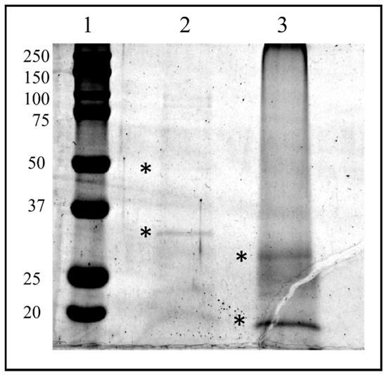 SDS-PAGE of biological active HPLC fraction Ovarian Proteins extracted from T. nigriceps. HPLC fraction proteins were separated on a 12.5% SDS-PAGE gel (Sigma, St. Louis, MO, USA) and stained with GelCode™ Blue Safe Protein Stain (Thermo Fisher Scientific). The bands marked with asterisks have been excised and analyzed with in situ hydrolysis digestion protocol and processed for LC/MS–MS analysis for protein identification. Lane 1: molecular weight marker (expressed in kDa) “All Blue Standards Biorad” (Biorad, Hercules, CA, USA); lane 2: proteins from HPLC fraction #22; lane 3: proteins from HPLC fraction #26.