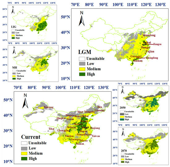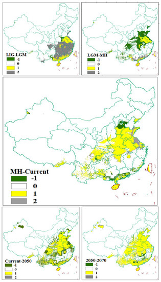 The prediction results of the habitat suitability of C. chinensis in China under six different periods are shown in Figure 1. From LIG to 2080, this beetle had experienced population shrinkage and expansion with environmental changes in different periods. For high suitability regions, the distribution of C. chinensis was mainly in the southeast of China under LIG scenario; these showed a significant reduction under the LGM scenario. The distribution of C. chinensis was mainly in Shandong, Anhui, Henan and Jiangsu from LGM to 2070, and the scope was constantly increasing. The low and medium suitability regions were enlarged successively under the six periods in North China. The changes in habitat suitability of C. chinensis are shown in Figure 2. Between the LIG and LGM periods, the habitat suitability had a significant contraction in the southeast of China. Comparison of the LGM and MH periods showed that the habitat suitability had a significant expansion in the middle-east of China, and then, around the original sites. Under LGM climatic conditions, only the east (parts of Jiangsu and Anhui) and the south of China (the coastal areas of Hainan, Guangdong and Guangxi) provided potential refuges for C. chinensis.