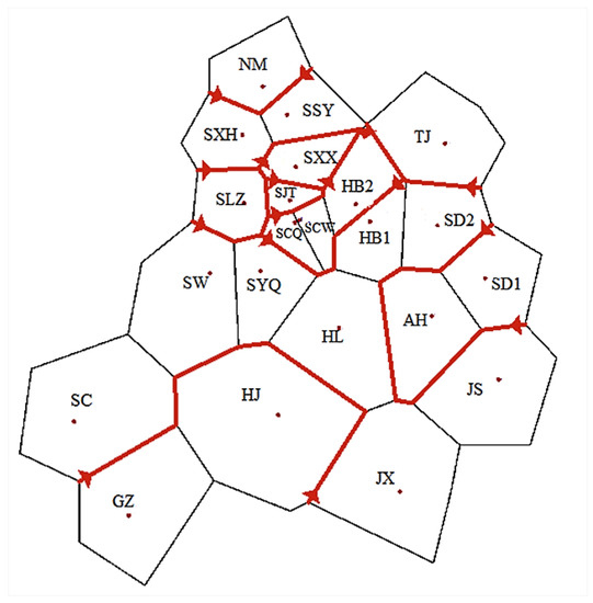 Genetic boundaries detected by barrier analysis based on Monmonier’s algorithm. Black lines show Voronoi tessellation and red lines labeled areas indicate genetic discontinuities. The red lines with arrows at both ends indicate the eight main boundaries.