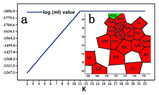The approach for identifying the population genetic structure of Callosobruchus chinensis in China based on concatenated mitochondrial genes. (a) When K was 2, the log (ml) value was used as the optimal value of the population space grouping; (b) BAPS clustering.