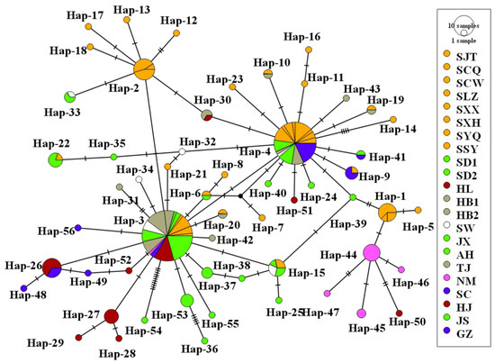MJ analysis of the network of Callosobruchus chinensis based on concatenated mitochondrial haplotypes. The circles represent different haplotypes with their proportional to the number of individuals. The colors represent different populations. The short line segments indicate mutated positions between haplotypes.