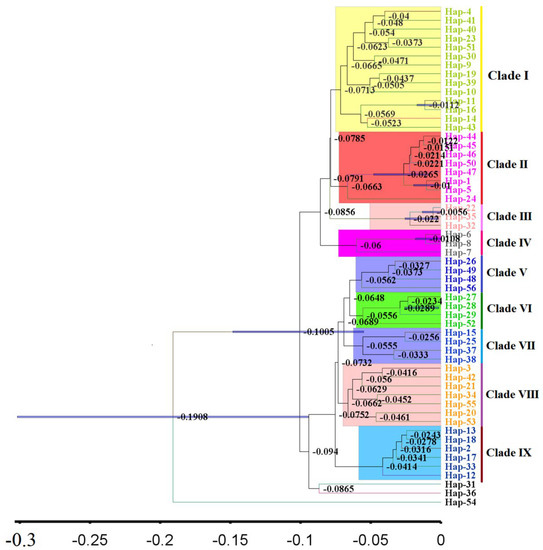 The results from the BEAST analysis showed that the two big branches began to diversify at 0.1005 Ma (Figure 6). The first one had four clades, named Clade I, Clade II, Clade III and Clade IV, and the divergence of the four clades occurred at 0.0713, 0.0785, 0.0791 and 0.0856 Ma, respectively. The second branch had five clades, called Clade V, Clade VI, Clade VII, Clade VIII and Clade IX, and the divergence of five clades occurred at 0.0562, 0.0648, 0.0689, 0.0732 and 0.0752 Ma, respectively (Figure 6). The divergence time of the populations were mainly between 0.05 Ma and 0.11 Ma. The unimodal mismatch distributions, and the significant negative values of Tajima’s D and Fu’s Fs, indicated that C. chinensis populations have experienced a recent expansion (Table 2 and Figure 7a). The Bayesian skyline plots (BSP) indicated the demographic history of C. chinensis in China (Figure 7b). It also showed that the population of C. chinensis may have experienced three main periods: the first stage was a prolonged phase of demographic stability; the second stage was a recent population expansion during 0.0125 Ma and 0.025 Ma; the third stage was a prolonged phase of demographic stability after 0.0125 Ma (Figure 7b).