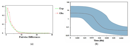 (a) Mismatch distribution curves of the entire samples for Callosobruchus chinensis. Observed and expected mismatch distribution are the red and green lines, respectively. (b) Historical demographic trends of the entire samples of Callosobruchus chinensis in China were implemented by Bayesian skyline plots (BSP), using an estimated rate of 0.0115 substitutions/site/MY and a standard deviation of 0.0005. The historical time (Ma) is displayed on the x-axis, and the effective population size is shown on the y-axis. The black solid line represents the median of population size, and blue areas represent 95% HPD.