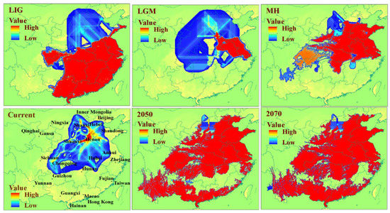 The LCP analysis of C. chinensis based on shared haplotypes showed the putative dispersal corridors for the six periods (Figure 8). Change in the climate in the six periods has resulted in drastic changes in the genetic connectivity of the C. chinensis population (Figure 8). In the LIG period, high genetic connectivity occurred in the southeast of China. In the LGM period, the scope enormously shrank, and the high genetic connectivity of C. chinensis mainly occurred in Jiangsu, Anhui and Henan. In the MH period, there was a huge expansion around the sites of Hebei, Shandong, Shaanxi, Jiangsu, Anhui, Henan and Hunan. In the present period, the high genetic connectivity of C. chinensis mainly occurred in the region of Shanxi-Henan-Hebei. Finally, in the future of 2050 and 2070, the landscape connectivity revealed that C. chinensis will disperse widely in north China (Beijing, Tianjin, Hebei, Shanxi), east China (Shanghai, Jiangsu, Zhejiang, Jiangxi, Anhui, Fujian and Shandong), central South China (Henan, Hubei, Hunan, Guangdong, Guangxi and Hainan), southwest China (Chongqing, Sichuan, Guizhou and Yunnan) and Shaanxi.