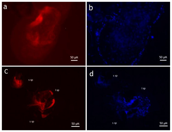 Aedes albopictus reproductive system observed after mating with virgin rhodamine-fed male (magnification 400×). (a). Bursa inseminalis marked with rhodamine (b). Same bursa inseminalis marked with DAPI (sperm are visible) (c). spermathecae marked with rhodamine (d). same spermathecae with DAPI. s sp indicate small spermatheca and l sp large spermatheca.