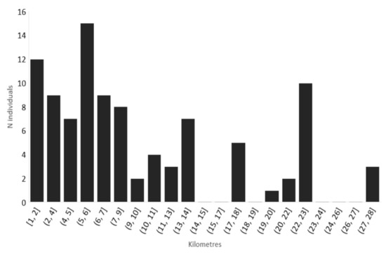 The territories beyond the Pyrenees had been colonized after only 3 or 4 years. The pioneers had to bridge a bird fly distance (air distance) of at least 28 km (https://www.distancefromto.net/ (accessed date 20 October 2020)) between the 2017 most northern populations recorded in the south of the mountain range (Avinyonet de Puigventós, Catalonia, Spain) and the village of Maureillas-las-Illas in France. The simplest and most logical natural path to traverse the Pyrenees in this area is the corridor formed by the rivers Llobregat and Rome, separated by the Perthus Pass (290 m). The first individuals passed the border in early 2020 or maybe the year before. This distance (28 km) could be overcome in one or various steps, because some specimens seem to be able to disperse over distances between 15 and 23 km, as can been seen in Figure 2.