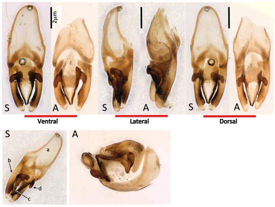 Comparison of Spanish (Extremaduran) and Argentinian Photinus aedeagi. Top panels: ventral, lateral and dorsal views of the aedeagi for a Spanish (S) and Argentinian specimen of P. signaticollis (A). Lower panels: semi-lateral (S) and bottom (A) views, facilitating the understanding of the aedeagus structure. Aedeagi are shown in the physiological head (up)–tail (down) orientation, as proposed by Dr. Lesley Ballantyne [26]; basal piece (a), lateral lobe (b), median lobe (c), dorsal basal projection (d)—aedeagal nomenclature following [13].