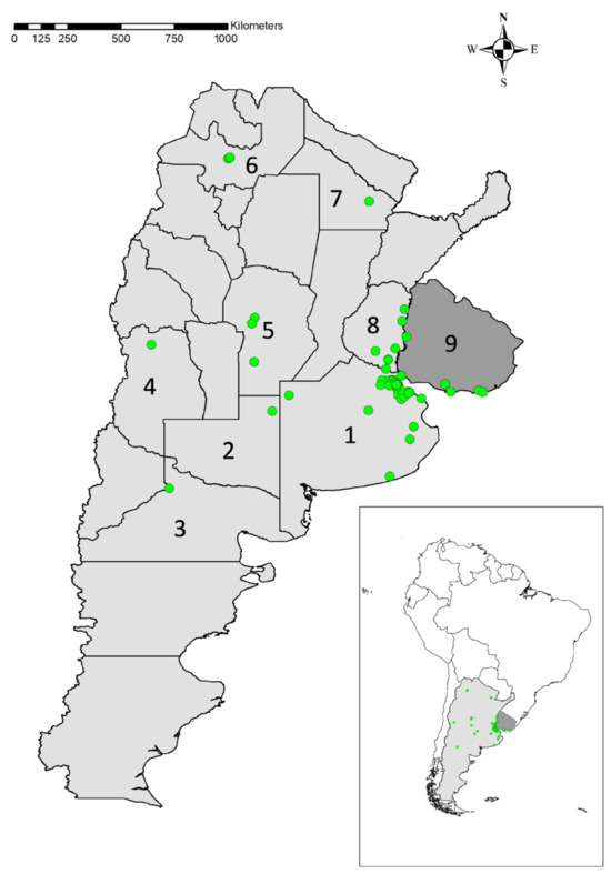 South American observations. Numbers 1 to 8 indicate the Argentinian provinces where the species has been recorded (1—Buenos Aires; 2—La Pampa; 3—Río Negro; 4—Mendoza; 5—Córdoba; 6—Salta; 7—El Chaco; 8—Entre Ríos. N° 9 indicates Uruguay (source: www.inaturalist.org; www.ecoregistros.org; www.fotosaves.com.ar (all accessed 20 October 2020)).